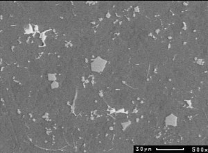 Aluminium-Legierung einer Bremstrommel. In der AlSi-Legierung (dunkel) erkennt man polygonale Chrom-Eisen-Kristalle (hellgrau), dünne Fe-Nadeln (hellgrau) und Eisen-Kupfer-Schlieren (weiß).