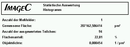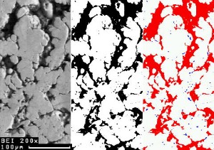 Oben: Bildersequenz aus Rückstreuelektronenbild, binarisiertem Schwarz-Weiß-Bild und ausgewertetem Bild. Rot: zur Flächenanalyse zugelassener Bereich. Blau: ausgeschlossener Bereich (Unregelmäßigkeiten im Originalbild, keine Poren). Die drei Einzelszenen zeigen den selben Bildausschnitt. Unten: Ergebnis der automatischen Bildanalyse. Bestimmt wurde der Flächenanteil mit ImageC von Imtronic. REM, Rückstreuelektronenbild, Originalvergrößerung 200x. |