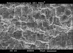 Dauerschwingbruch (ein Ermüdungsbruch) im Stahlblech einer Lampenaufhängung. Treppenförmiger Bruch.