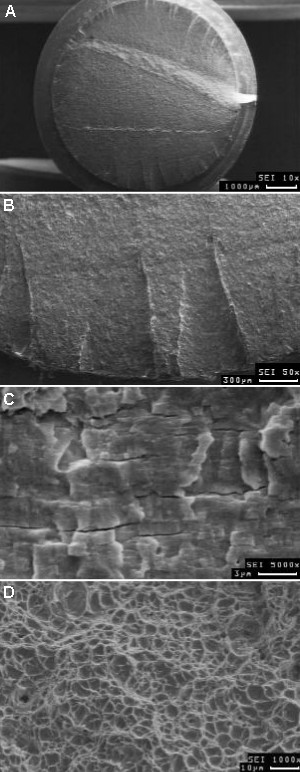 Dauerschwingbruch an einer Schraube. Bruchausgang am Gewindeansatz Bild A: Übersicht der Bruchfläche mit dem Restbruch in der Mitte. Bild B: Ausgangsbereich des Dauerschwingbruchs. Bild C: Rastlinien im Bereich des Schwingbruchs. Bild D: Duktiler Restbruch. REM, Sekundärelektronenbild, Originalvergrößerung 10x (Bild A), 50x (Bild B), 5000x (Bild C), 1000x (Bild D). |