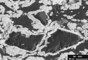 Diamanten (dunkel) mit Nickelhülle (hell) im Kunstharzbindung (dunkel) mit Kupferpulver (hell) und Kalziumoxid (grau). Gegenüber dem Auflichtbild ist das REM-Bild ausreichend tiefenscharf, so dass sich das unvermeidliche Polierrelief nicht störend auswirkt. Nachteil: Der Kontrast von Elementen mit gleicher oder sehr ähnlicher Ordnungszahl (Matrix und Diamant aus Kohlenstoff, Kupferpulver und Nickelhülle) lassen sich durch den Grauwertunterschied nicht unterscheiden. REM, Rückstreuelektronenbild, Originalvergrößerung 500x. |
