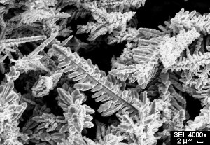 Dendritisches Kupferpulver. Solche Pulver werden z. B. als wärmeableitender Füllstoff bei trockenarbeitenden, kunstharzgebundenen Diamantwerkzeugen verwendet. Das Bild hat freundlicherweise Frau Elke Landrock-Bill vom Biomechaniklabor der FH Giessen zur Verfügung gestellt. REM, Sekundärelektronenbild, Originalvergrößerung 4000x. |