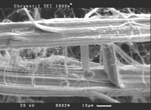 Chrysotil-Faserbündel aus einer Asbestzement- Platte. Das Bild zeigt eindrucksvoll zwei der wichtigsten Eigenschaften von Asbest: die Flexibilität seiner Fasern und die beinahe unbegrenzte Spaltbarkeit in immer dünnere Fasern. Die erste Eigenschaft hat in der Vergangenheit zur Verwendung von Asbest feuerfester Spinnstoff geführt. Die zweite Eigenschaft ist die gesundheitlich relevante: Die feinsten Fasern sind lungengängig, können also eingeatmet werden. Obwohl Asbest völlig ungiftig ist, können die Fasern in den Lungenbläschen Krebs auslösen, weil sie eine Dauerreizung bewirken, gegen die die Abwehrstoffe des Körpers machtlos sind. Die Fasern lassen sich nämlich weder einkapseln noch abbauen. REM, Sekundärelektronenbild, Originalvergrößerung 1000x. |