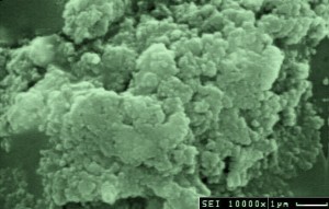 Silikonöl-Verunreiningung auf einem zur Lackierung bestimmten Aluminium-Blech. Die Elementanalyse mit EDX ergibt Silizium und Sauerstoff, die Partikeloberfläche ist deutlich von Quarz zu unterscheiden. Eine der unangenehmsten Oberflächenverschmutzungen, weil sie abstoßend auf Lacke wirkt und schlecht zu entfernen ist. REM, Sekundärelektronenbild, Originalvergrößerung 10000x. |