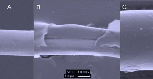 Faser in einer Lackoberfläche (Bild B), verglichen mit zwei Vliesen, die als Verursacher in Frage kommen. Die Fasern von Vlies A stimmen im Durchmesser mit der Lackfaser B überein, während Vlies C zu dicke Fasern besitzt. REM, Sekundärelektronenbild, Originalvergrößerung 1000x. |