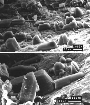 Stubensandstein-Formation, Trias, Böblingen (Deutschland). REM, Sekundärelektronenbild, Originalvergrößerung 1000x (oben) und 1600x (unten). |