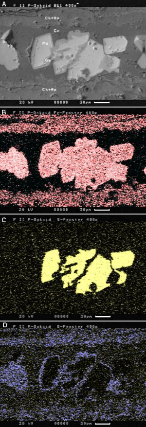 Pyritkristalle in einer mit Kalzit gefüllten Kluft eines Phosphorit-Onkoids. Bild A: Elementkontrast mit Pyrit (Py), Goethit (Go), Calcit (Cc) und Chamosit und Apatit (Ch + Ap). Bild B: Verteilung von Eisen. Bild C: Verteilung von Schwefel Bild D: Verteilung von Sauerstoff Eisen befindet sich sowohl in Pyrit und Goethit als auch im Chamosit. Die Unterscheidung von Pyrit und Goethit gelingt über die Verteilung von Schwefel (im Innern der Kristalle: Pyrit) und Sauerstoff (als Randsaum: Goethit). Der Pyrit ist vermutlich vom Rand her zu Goethit oxidiert. Pyrit und Goethit sind als kleine Körner schon im Lichtmikroskop zu erahnen. Unter-Kreide. Sierra de Fontcalent, Provinz Alicante (Spanien). REM, Rückstreuelektronenbild und Röntgenverteilungsbilder, Originalvergrößerung 400x. |