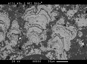 Diagenetische Manganoxid-Dendriten ("Blumenkohlstrukturen", hell) in pelagischem Rotkalk (dunkel). Sie umschließen karbonatische Komponenten und enthalten im Gegensatz zu primären Goethit-Stromatolithen keine Mikrobesiedler. Unter-Callov, Mitteljura. Sierra del Reclot, Provinz Alicante (Spanien). REM, Rückstreuelektronenbild, Originalvergrößerung 500x. |
