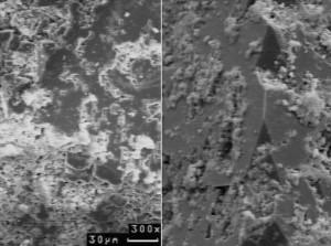 ![]() Links: schlecht besputterte Probe mit aufgeladenen Objektkanten. Rechts: gleiche Probe, gut mit Gold besputtert. Authigener Quarz mit Ätzspuren von Pilzen.  |