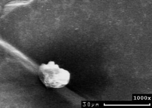 ![]() Nicht anhaftender Partikel, der elektrisch aufgeladen ist und mehr Sekundärelektronen emittiert als die Umgebung, die dunkel erscheint.  |