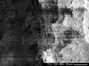 | Stark poröse oder schlecht verfestigte Proben sind schwierig leitfähig zu machen, weil das Gold beim Sputtern nicht in die Porenräume gelangt. Oft kommt es dann unter dem Elektronenstrahl zu Aufladungen an Kanten oder in Vertiefungen, die sich als helle Überblendungen bemerkbar machen und die Bildinformation zerstören. Einzeln aufliegende Partikel leuchten hell mit einem schwarzen Hof auf. Bei steigender Vergrößerung tauchen parallel zum Strahlraster dunkle Streifen auf, die ein sinnvolles Fotografieren unmöglich machen. Auch die Röntgensignale für die Elementanalyse werden verfälscht. |