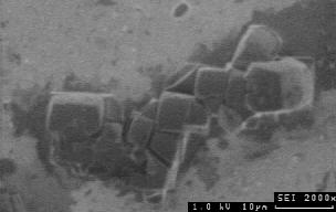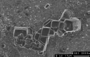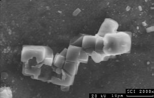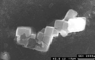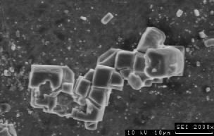 ![]() Anregungsspannung 40 kV: Kantendurchstrahlung an Steinsalzwürfeln. Obwohl würfelig vom Habitus, erscheinen die Kristallkanten abgerundet, weil Sekundärelektronen auch innerhalb des Würfels angeregt werden. Der Kristall rechts wird vollständig durchstrahlt. Der Hintergrund, eine Schneckengehäuse, liefert kaum Oberflächeninformation. ![]() Anregungsspannung 20 kV: deutliche Kantendurchstrahlung und Verrundung der Oberflächen der Steinsalzkristalle, geringe Oberflächeninformation der Umgebung. ![]() Anregungsspannung 10 kV: Kantendurchstrahlung der Steinsalzkristalle, Relief auf den Kristallflächen schwach erkennbar, mäßige Oberflächeninformation der Umgebung. ![]() Anregungsspannung 5 kV: geringe Kantendurchstrahlung der Steinsalzkristalle, Relief auf den Kristallflächen gut erkennbar, gute Oberflächeninformation der Umgebung. ![]() Anregungsspannung 1 kV: kaum Bildinformation von den Steinsalzkristallen und der Umgebung durch zu geringe Anregung, Abbildung von Kontaminationsschichten (dunkel) unmittelbar an der Oberfläche.  |