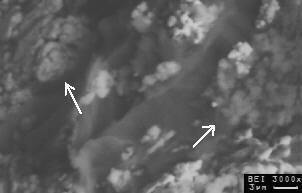Mit niedriger Anregungsspannung und guter Goldbesputterung lässt sich der Effekt weitgehend unterdrücken. Umgekehrt lässt sich der Effekt nutzen, um dünne Beschichtungen zu durchdringen und die Oberfläche des Basismaterial abzubilden (z. B. SiOx-Schichten auf Stahl. ![]() Anregung von Cu-Pulver an der Oberfläche (weiß) und unter dünner Kunstharzbedeckung (grau, Pfeile) in einem harzgebundenen Diamantschleifbelag. Das "elektronisch weiche" Kunstharz wird hier durchstrahlt.  |