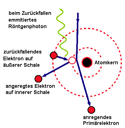 Eine weitere Wechselwirkung zwischen den Primärelektronen und den Atomen der Probe ist die Erzeugung von Röntgenstrahlung. Die Primärelektronen schlagen Hüllelektronen aus ihrer Bahn und heben sie auf ein höheres Energieniveau. Beim Zurückfallen geben die angeregten Hüllelektronen die zusätzliche Energie in Form von Röntgenquanten wieder ab. Weil die Energiehöhe, ausgedrückt in Kiloelektronenvolt keV, charakteristisch für jedes Energieniveau der Atome ist, lassen sich aus einem Impuls-Energiediagramm die angeregten Elemente bestimmen.