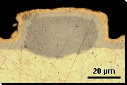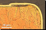 | Schichtgefüge | Mit Gefügeuntersuchungen am Querschliff werden Abweichungen vom Sollwert der Schichtdicke bestimmt, Unregelmäßigkeiten im Schichtaufbau und im Trägermaterial aufgedeckt und Haftungsfehler erkannt. |