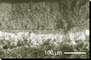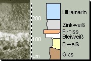 | Farbschichten | Die mikroskopische Abbildung von Pigmenten und Farbschichten am polierten Querschliff eines Farbpartikels zeigt Schichtdicken und Farbverteilung und dient als Voraussetzung zur chemischen Pigmentbestimmung. |