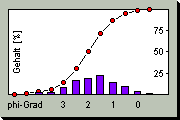 | Korngrößenverteilung | Die Verteilung der Korngrößen nach Klassen erfolgt in Histogrammen und Kornsummenkurven. Die logarithmische Einteilung wird meist in ganzzahligen phi-Graden angegeben. Daraus ergeben sich Aussagen für den Baugrund oder die Durchlässigkeit von Gesteinen. |